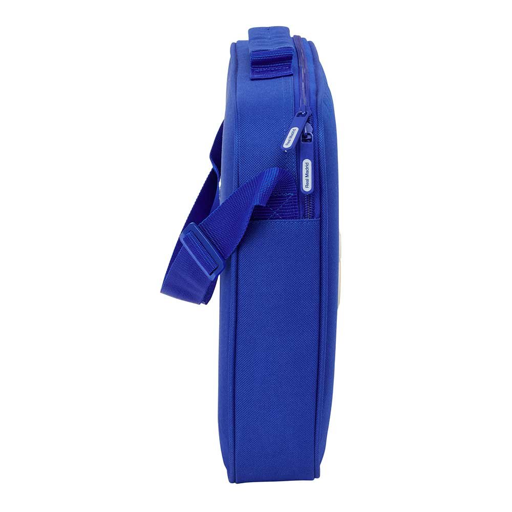 Pensada para la comodidad y el estilo, esta bandolera cuenta con una correa ajustable que permite llevarla cómodamente al hombro, adaptándose a su altura. Además, incorpora un asa de mano forrada en la parte superior, ofreciendo una opción adicional de transporte fácil y ergonómico. Su color AZUL vibrante y el diseño exclusivo del Real Madrid la convertirán en la envidia de todos sus compañeros.