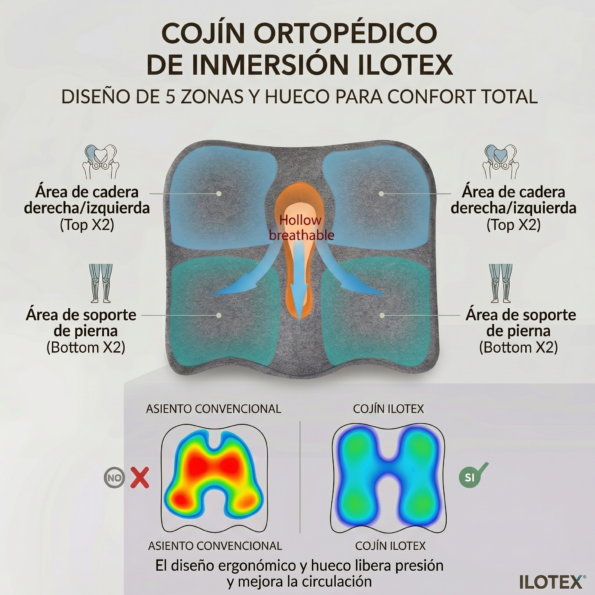 Presentado por ILOTEX, este cojín ortopédico de espuma viscoelástica de firmeza media-alta ha sido diseñado con una avanzada tecnología de soporte de 5 zonas y ajuste en forma de W. Su estructura contorneada se adapta a la curva natural de tus caderas, liberando la tensión acumulada en el coxis y mejorando tu postura durante las largas horas de trabajo, estudio o conducción.