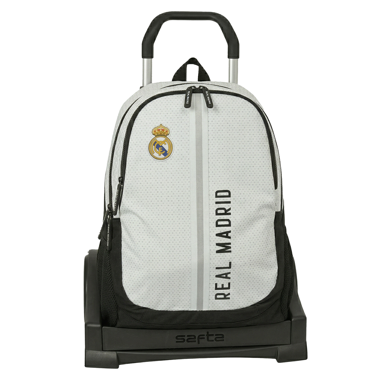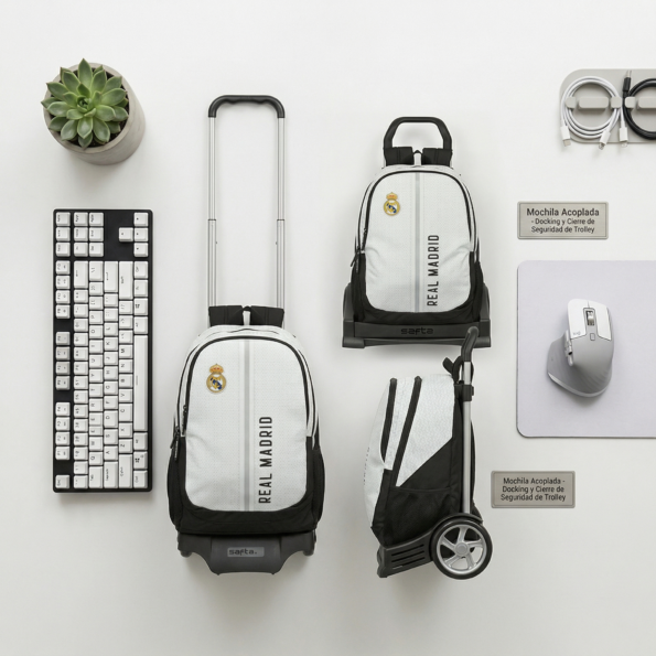 Presentada por SuperMochilas, este conjunto oficial del Real Madrid une la icónica mochila de la 2ª equipación con el carro de última tecnología. Diseñado para ofrecer una durabilidad extrema y una ligereza sorprendente, este sistema 2 en 1 protege la espalda de los más jóvenes permitiendo un desplazamiento suave y silencioso gracias a sus ruedas cubiertas de goma.