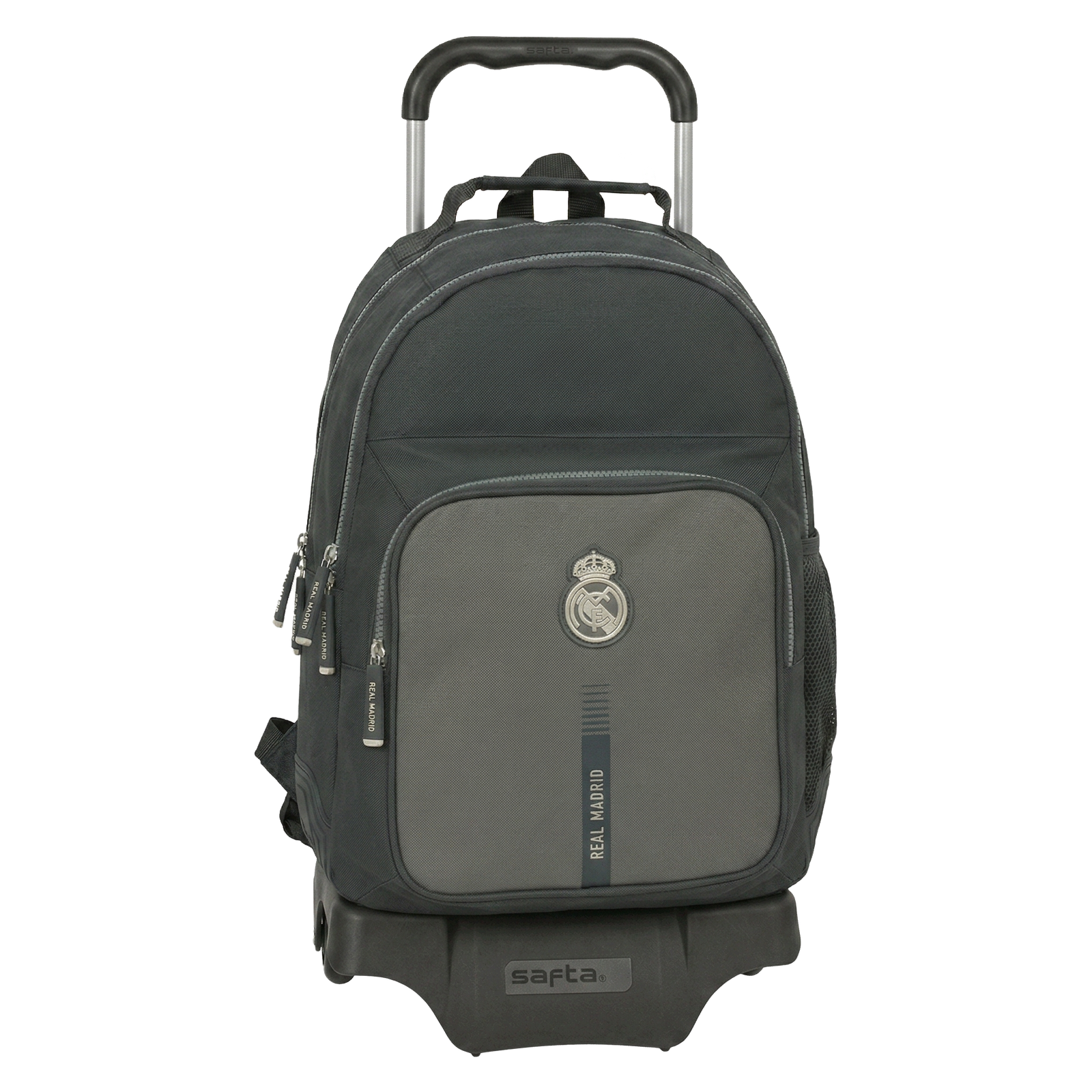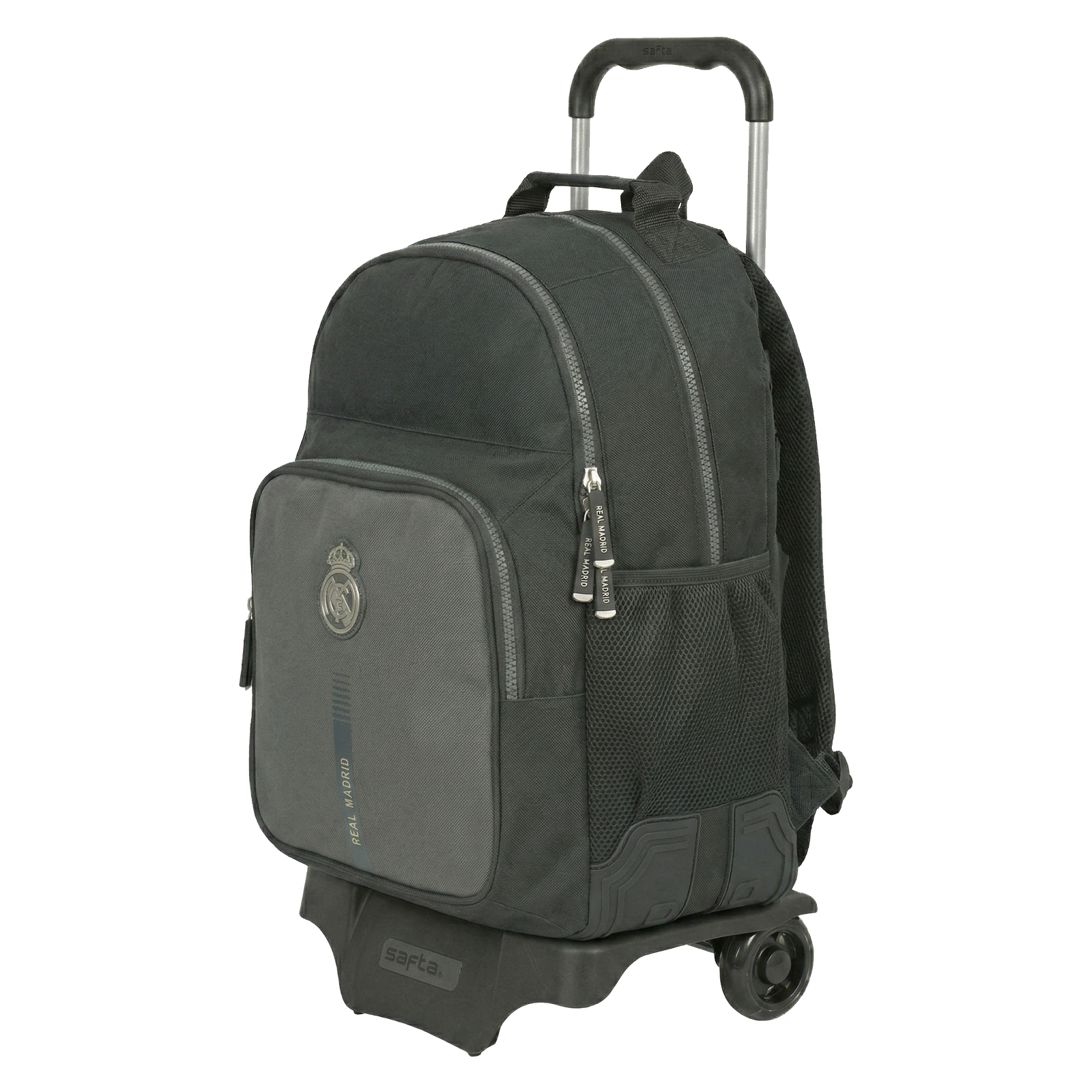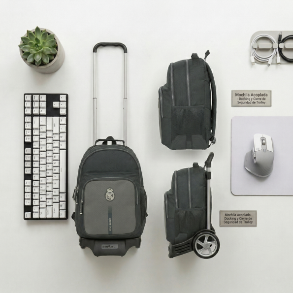 Presentada por SuperMochilas, este conjunto oficial del Real Madrid une la icónica mochila de la 2ª equipación con el carro de última tecnología. Diseñado para ofrecer una durabilidad extrema y una ligereza sorprendente, este sistema 2 en 1 protege la espalda de los más jóvenes permitiendo un desplazamiento suave y silencioso gracias a sus ruedas cubiertas de goma.