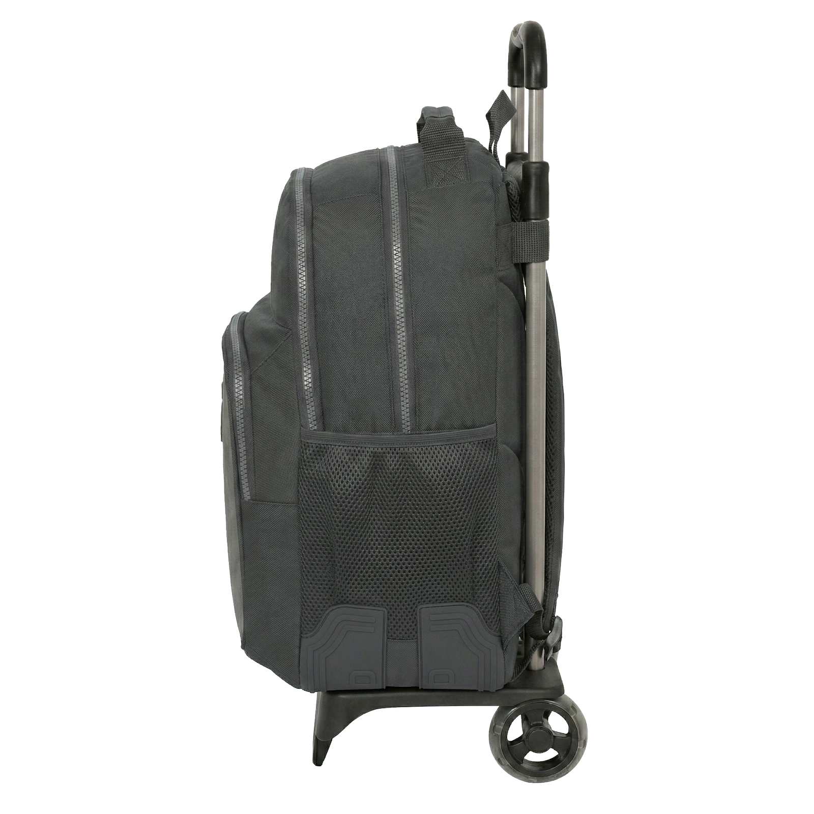 El corazón de este producto es su carro. Fabricado con una estructura de acero pintado y PVC de alta resistencia, se ajusta milimétricamente a la mochila para evitar vibraciones. Sus ruedas con cubierta de goma están diseñadas para absorber impactos y rodar en silencio sobre cualquier superficie, alcanzando una altura total de 85 cm para una postura ergonómica perfecta.