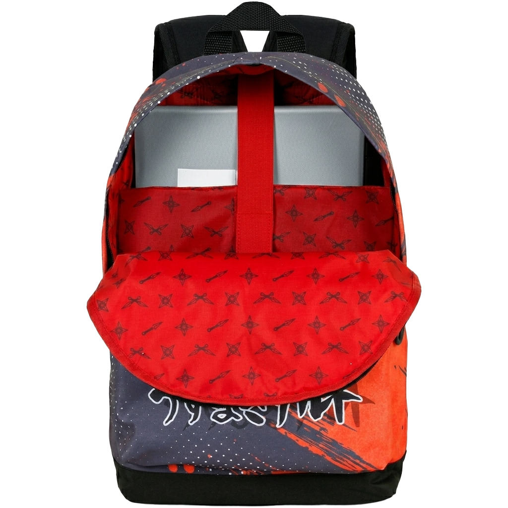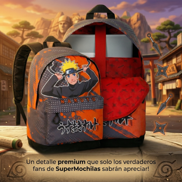 El exterior destaca por la vibrante ilustración de Naruto ajustándose su icónica banda, rodeado de detalles urbanos y tipografía japonesa. Pero la verdadera sorpresa está en su interior: al abrirla, descubrirás un forro rojo exclusivo estampado con kunais y shurikens. ¡Un detalle premium que solo los verdaderos fans de SuperMochilas sabrán apreciar!