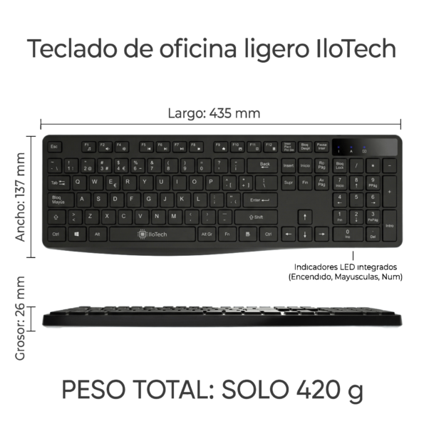 A diferencia de otros kits compactos que sacrifican la comodidad, el teclado IloTech es Full Size, incluyendo el bloque numérico completo, esencial para hojas de cálculo y tareas administrativas. Todo esto manteniendo un peso pluma de solo 420g, lo que te permite moverlo o guardarlo con total facilidad.