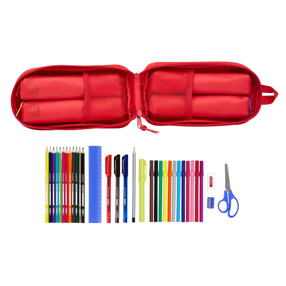 Confeccionado en resistente Nylon de color Rojo, este plumier está diseñado para soportar el ajetreo diario. Sus dimensiones compactas (11.71 cm largo x 24.44 cm ancho x 26.62 cm alto) y su peso ligero de solo 420 gramos lo hacen fácil de transportar, ya sea en la mochila o llevado por su práctica asa de mano superior. La apertura es sencilla gracias al doble tirador en la cremallera principal, mientras que un bolsillo frontal adicional con cremallera ofrece espacio extra para objetos pequeños.